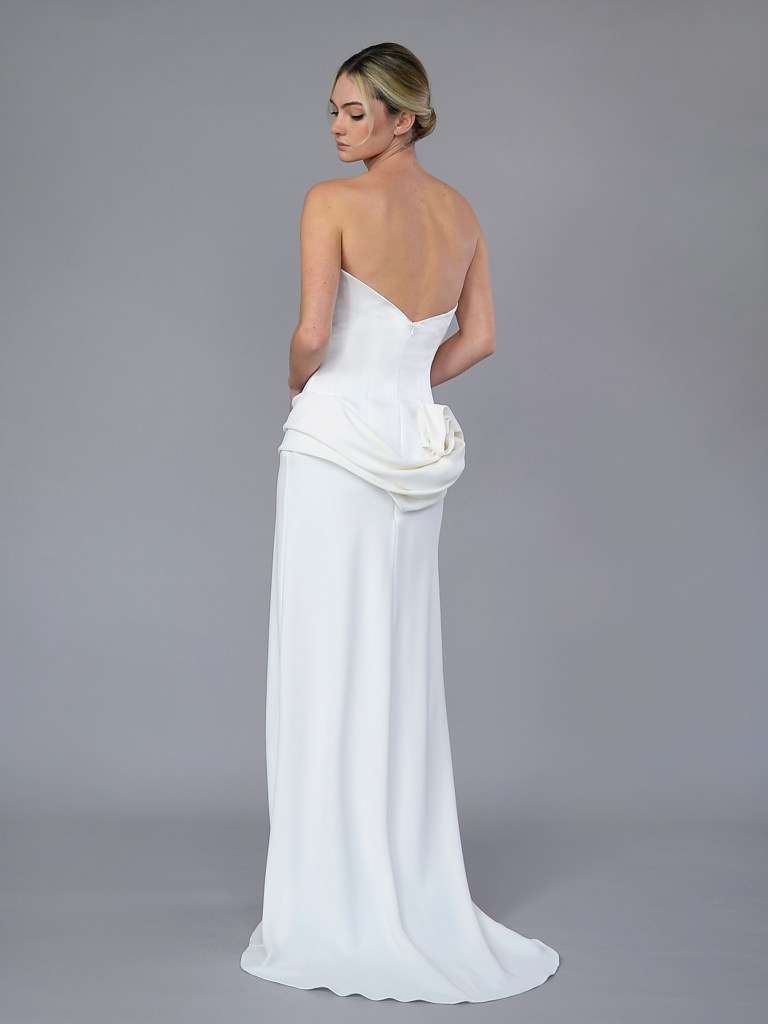 Partial corset dropped waist sheath gown in Duchessedama satin & imperial crepe. Lined with a silk charmeuse. Fabrics from Italy. A style from Carla & Kenneth collection. Made in USA.