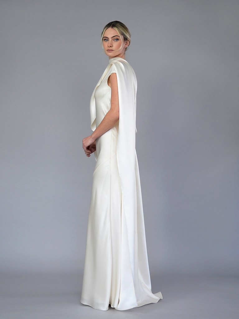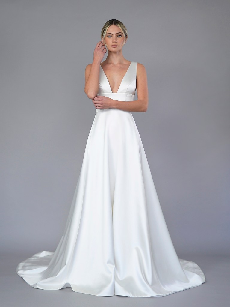 Wide V-neck full gown in rich Italian silk orchidea duchesse satin. Structured with a silk mikado face and a silk crepe de chine. Fabrics from Italy. A style from Signature collection. Made in USA.
