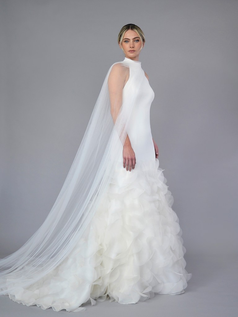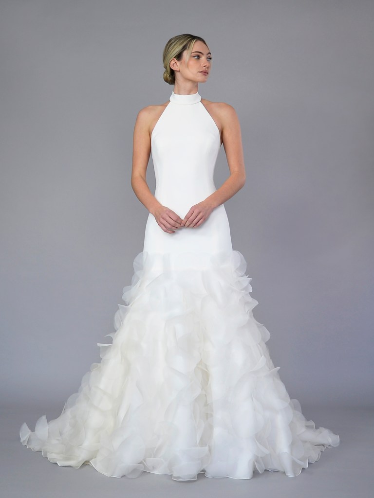 Halter neckline gown with Imperial crepe bodice and silk organza circle skirt. Structured with Imperial crepe face and a silk crepe de chine. Fabrics from Italy. A style from Signature collection. Made in USA.