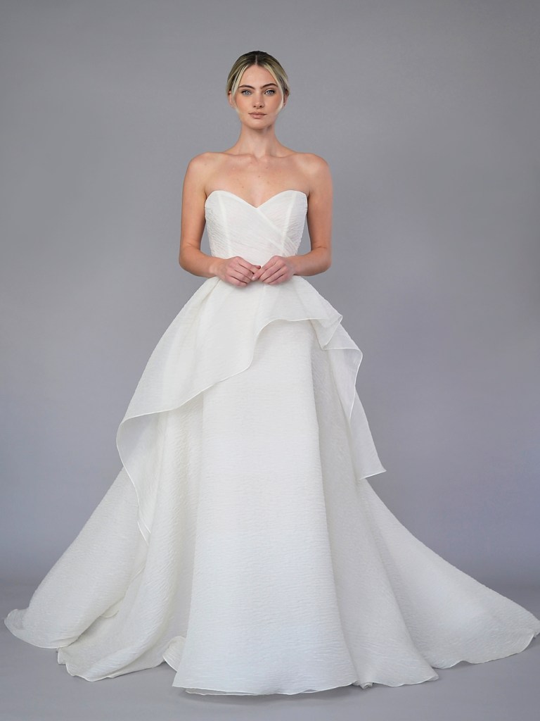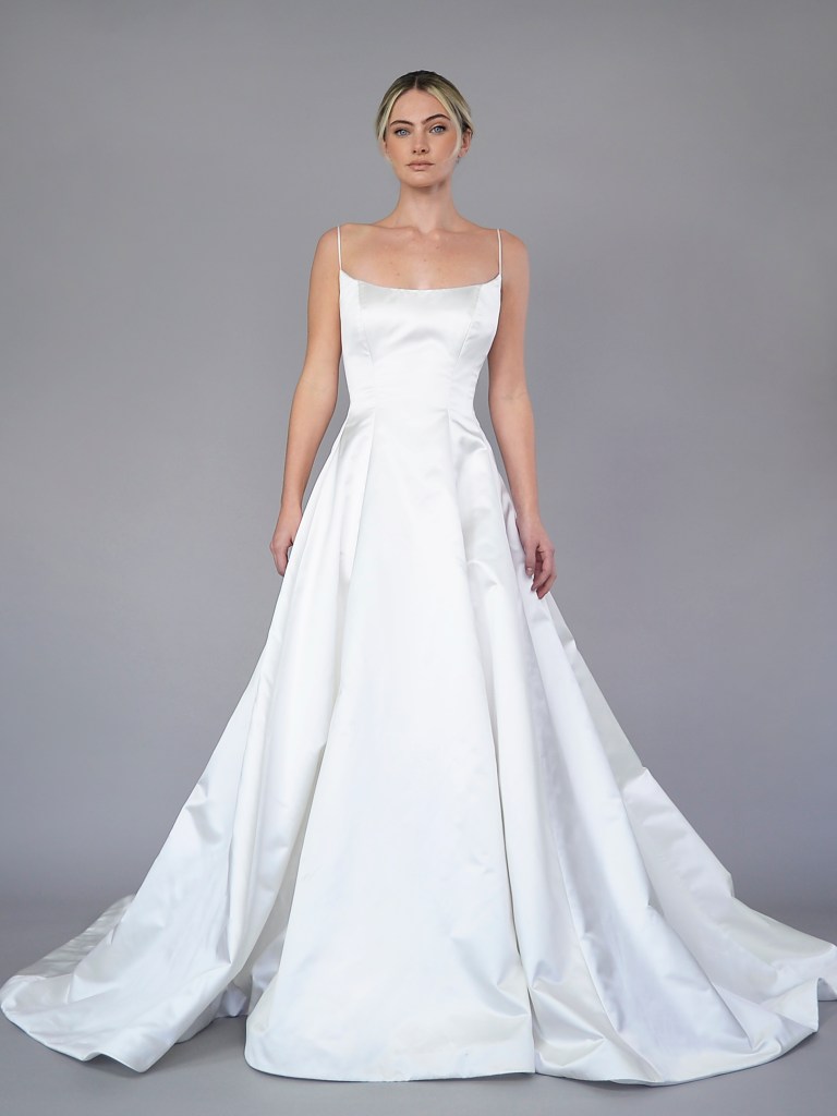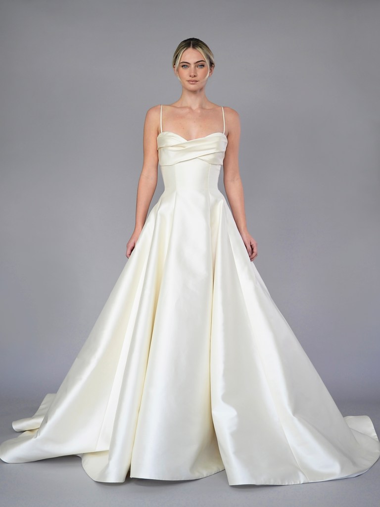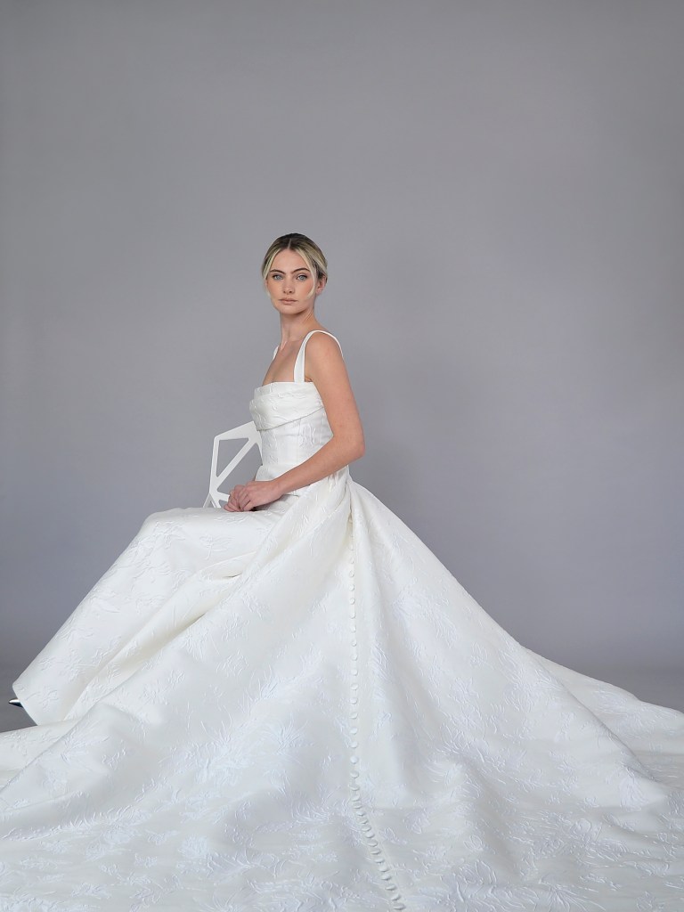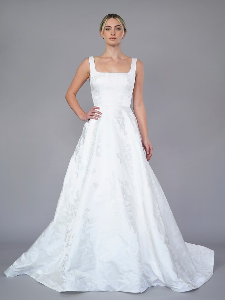 Partial corset straight neckline A-line gown in Italian Duchessedama satin and jacquard organza. Structured with a silk mikado face and a silk charmeuse. Fabrics from Italy. A style from Signature collection. Made in USA.