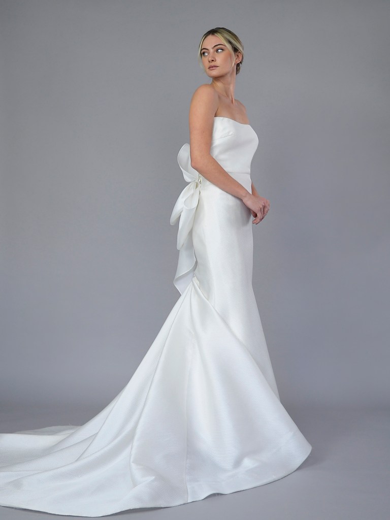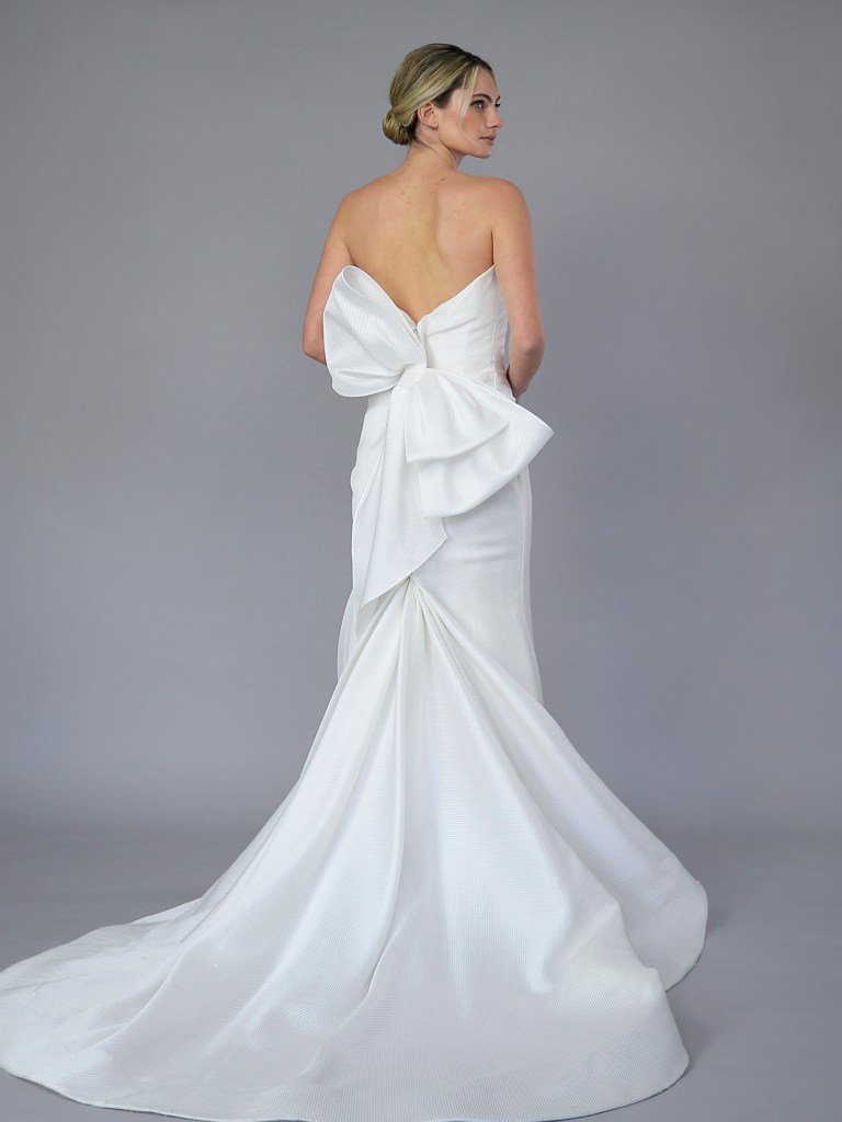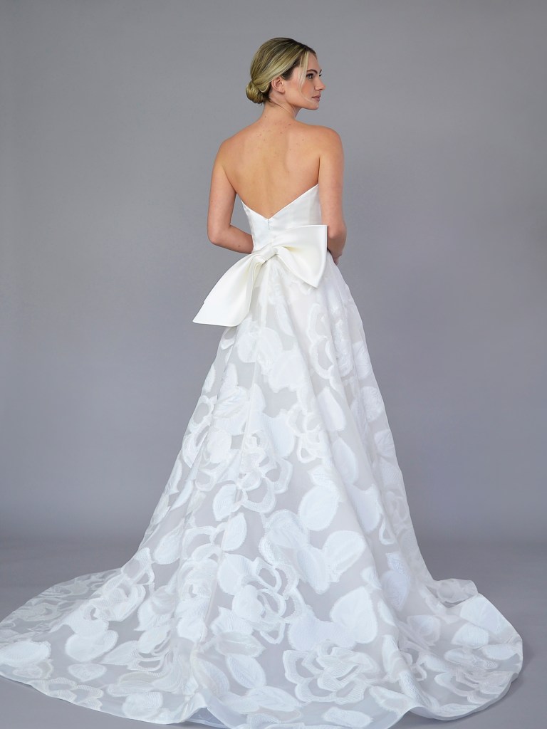 Fit & flare softened sweetheart neck gown with standing bow (in magnolia) & train in Italian silk jacquard Emma II. Structured with a silk organza face & lining. Fabrics from Italy. A style from Signature collection. Made in USA.