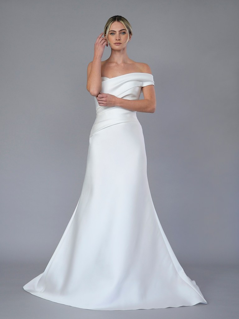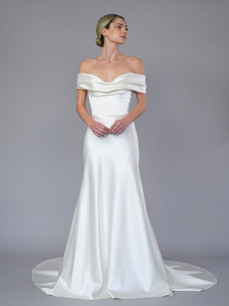 Off the shoulder neckline gown in French double charmeuse. Lined with a silk charmeuse. Fabrics from France. A style from Carla & Kenneth collection. Made in USA.