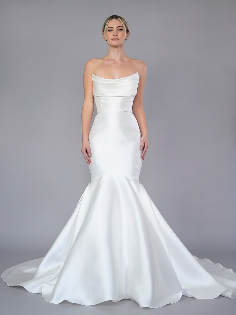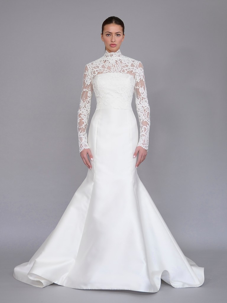 Mermaid sweetheart-neck gown in French Alencon lace. Structured with a silk mikado face and a silk crepe de chine. Fabrics from France & Italy. A style from Signature collection. Made in USA.