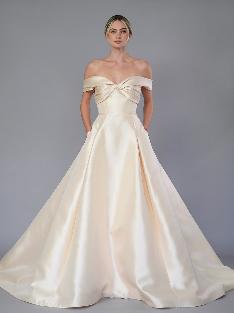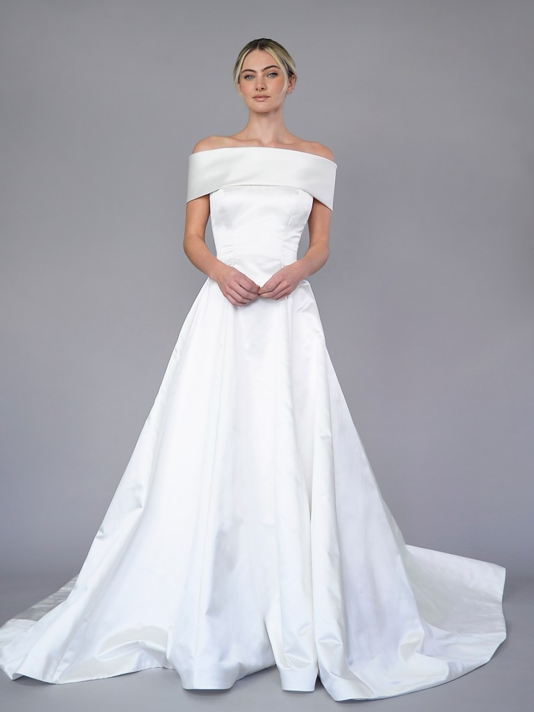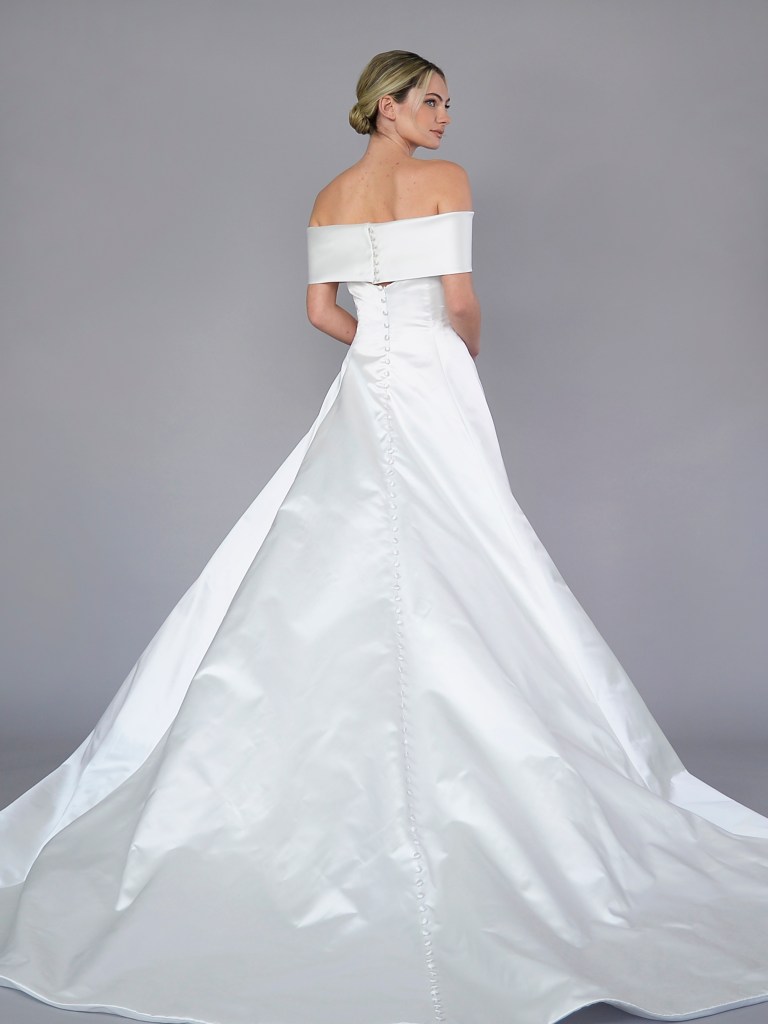 A-line off-shoulder gown in Italian silk jacquard garza. Structured with a silk mikado face and a silk crepe de chine. Fabrics from Italy. A style from Signature collection. Made in USA.