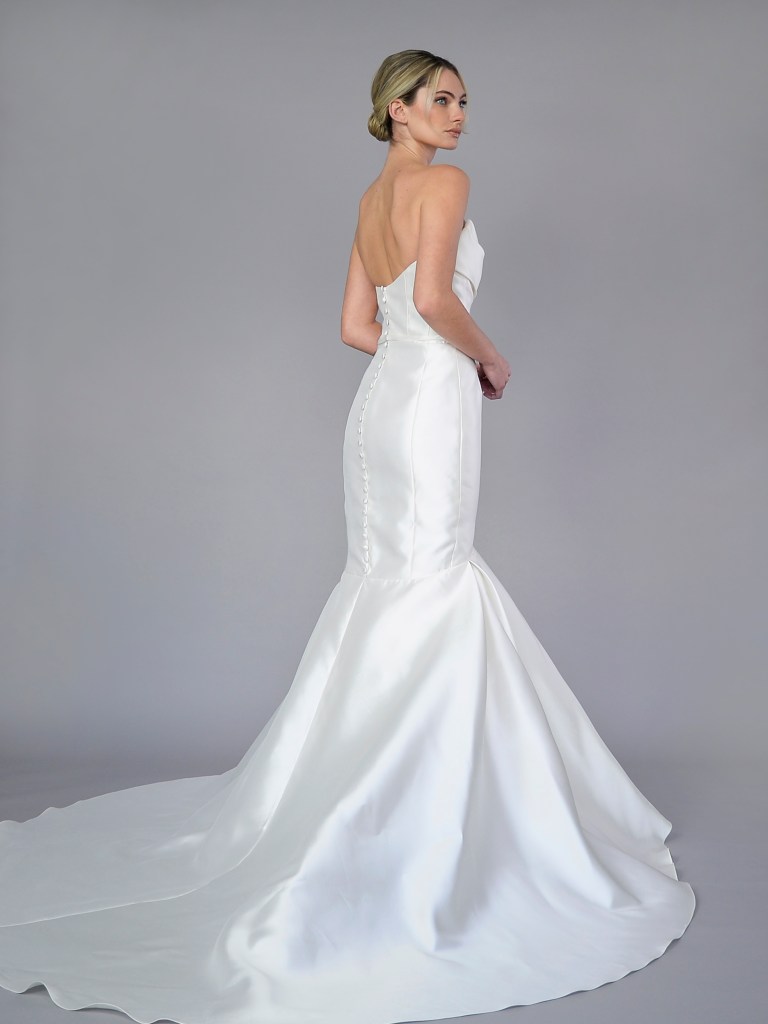 Fit & flare gown with removable train in luxurious Italian silk magnolia. Structured with a silk mikado face and a silk crepe de chine. Fabrics from Italy. A style from Signature collection. Made in USA.