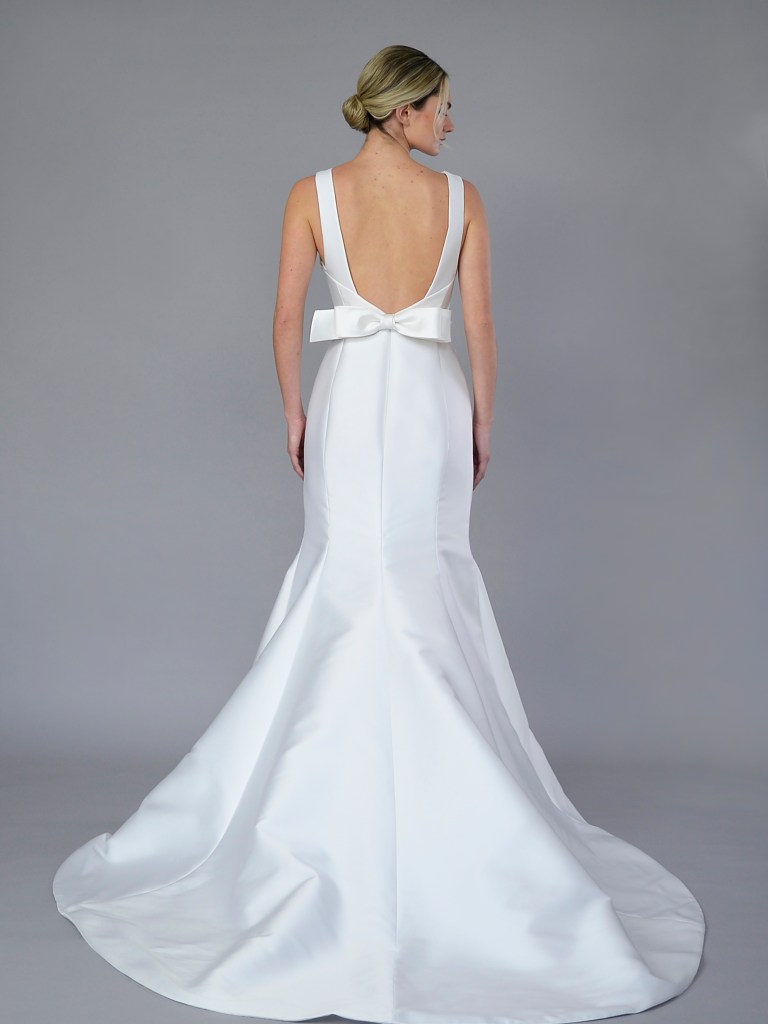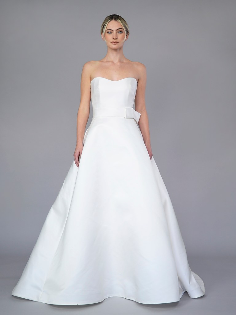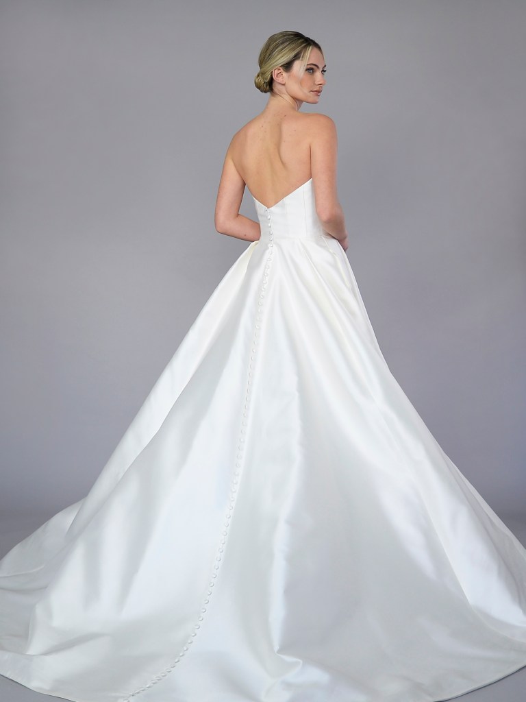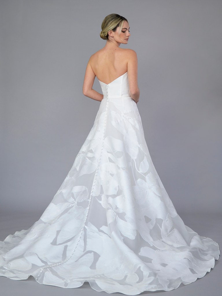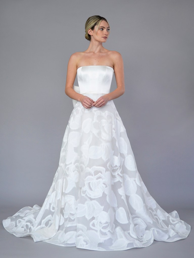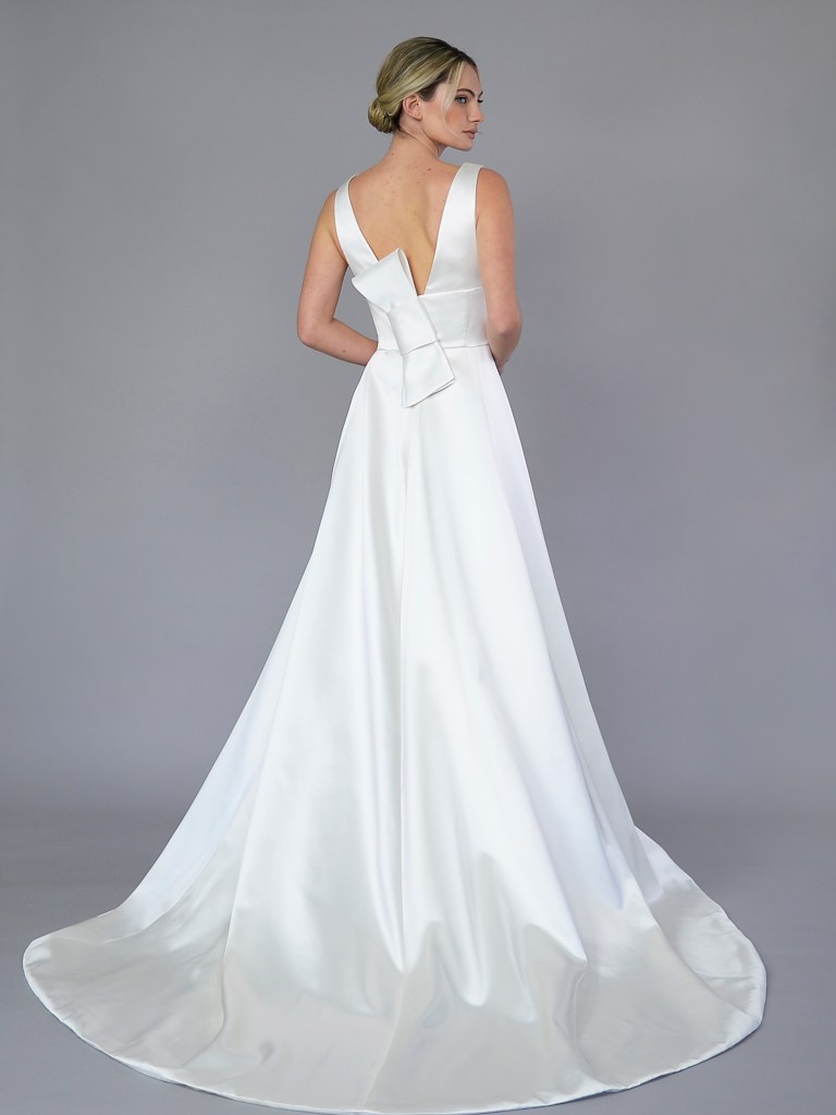 Partial corset straight neckline A-line gown in Italian silk satin jacquard with signature butterfly bow. Structured with a silk mikado face and a silk crepe de chine. Fabrics from Italy. A style from Signature collection. Made in USA.