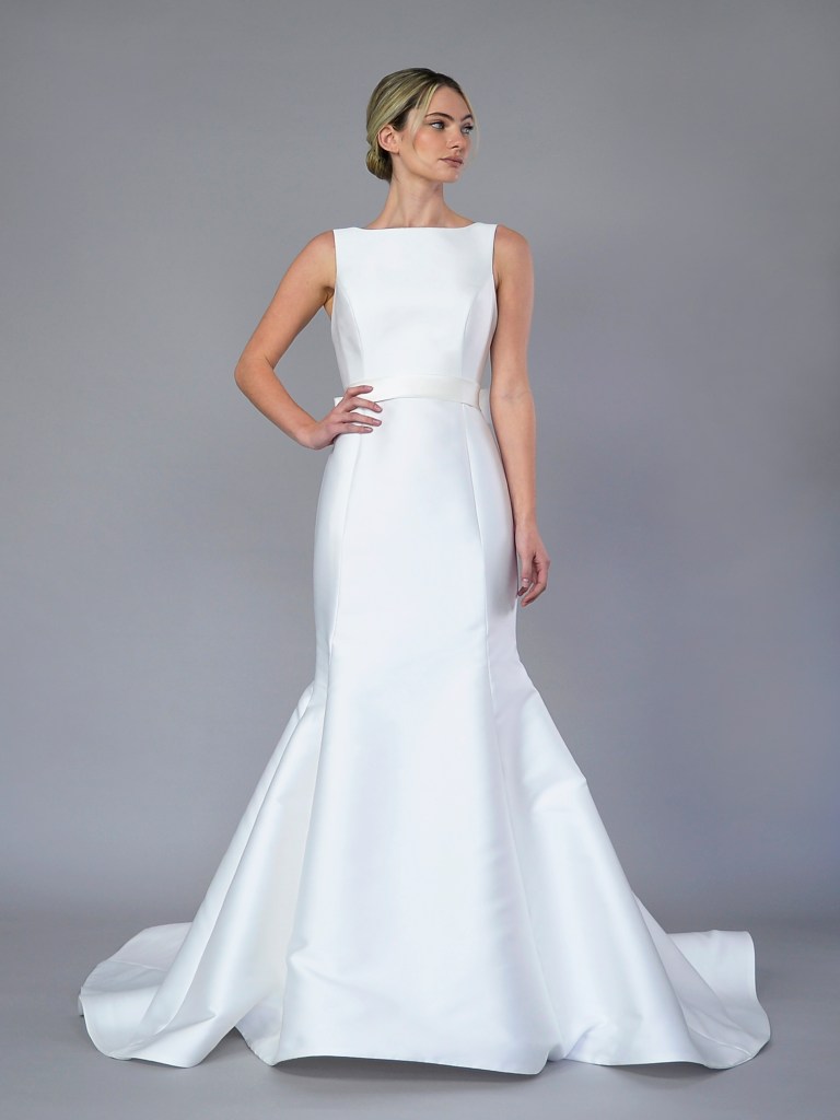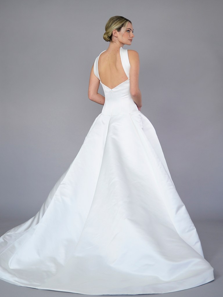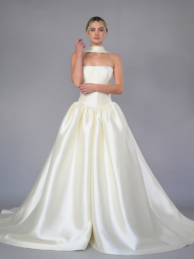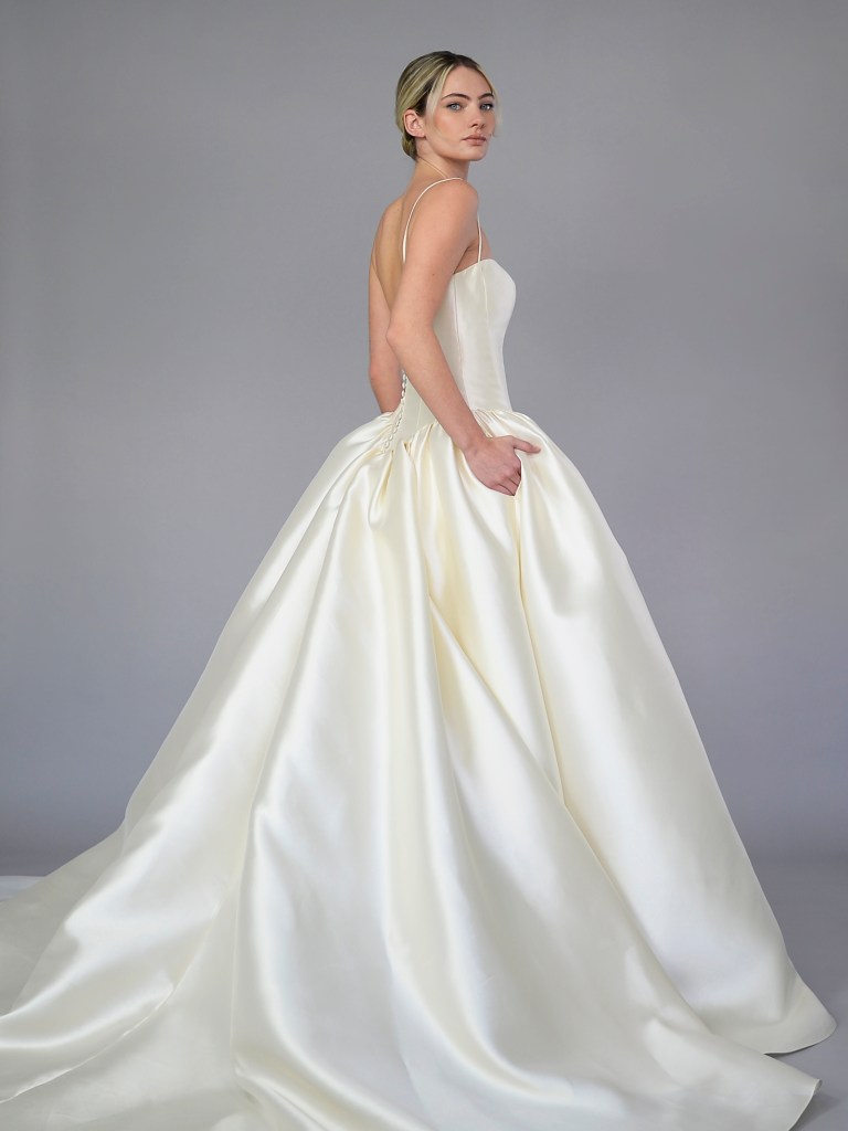 Dropped waist full gown in luxurious Italian silk magnifico satin. Structured with a silk mikado face and a silk crepe de chine. Fabrics from Italy. A style from Signature collection. Made in USA.