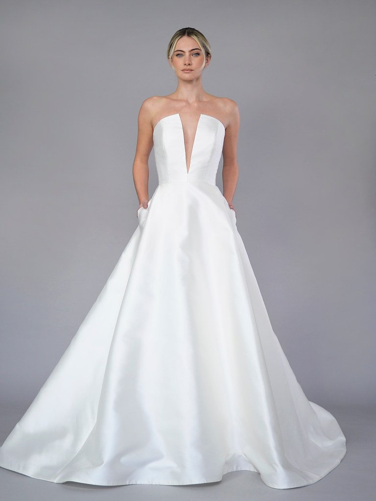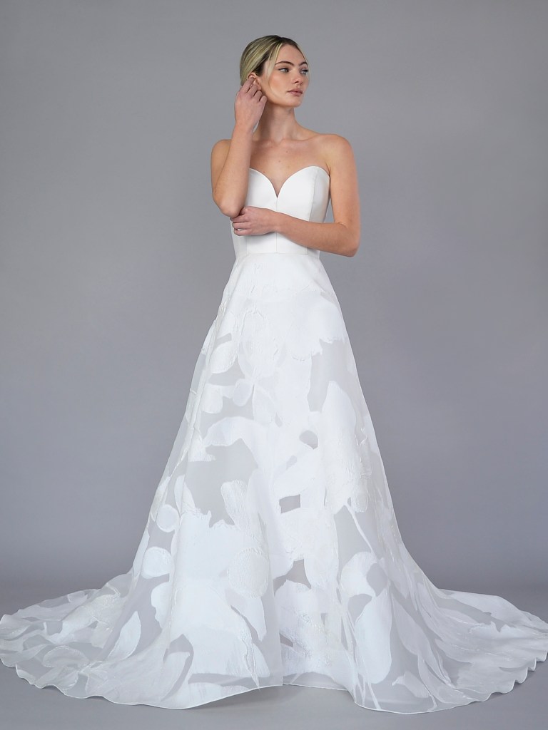 Deep sweetheart neckline A-line gown in Italian silk mikado and jacquard organza. Structured with a silk mikado face and a silk charmeuse. Fabrics from Italy. A style from Signature collection. Made in USA.