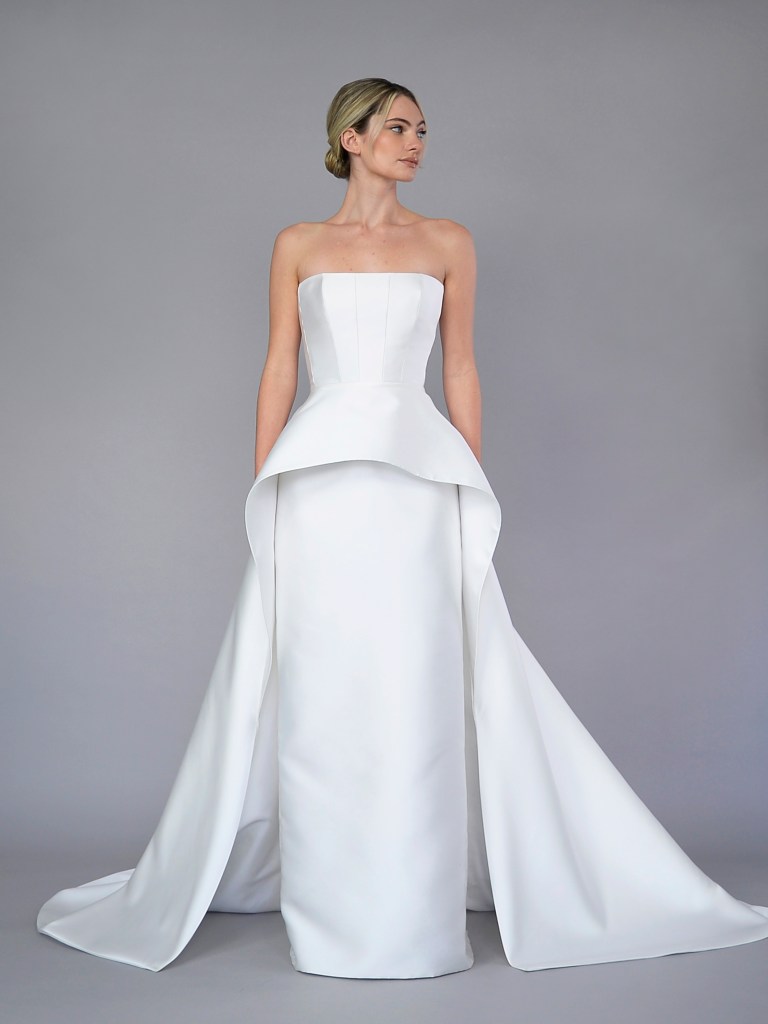 Partial corset straight neckline gown with removable peplum train (or with a sheer cape shawl) in pearl white Italian blended silk new magnolia. Structured with a silk mikado face and a silk crepe de chine. Fabrics from Italy. A style from Signature collection. Made in USA.