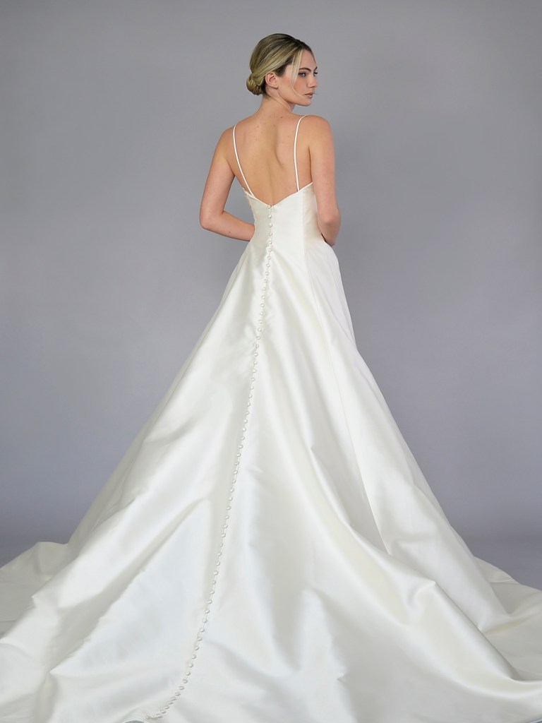 Full A-line gown in authentic Italian silk orchidea duchesse satin. Structured with a silk mikado face and a silk crepe de chine. Fabrics from Italy. A style from Signature collection. Made in USA.
