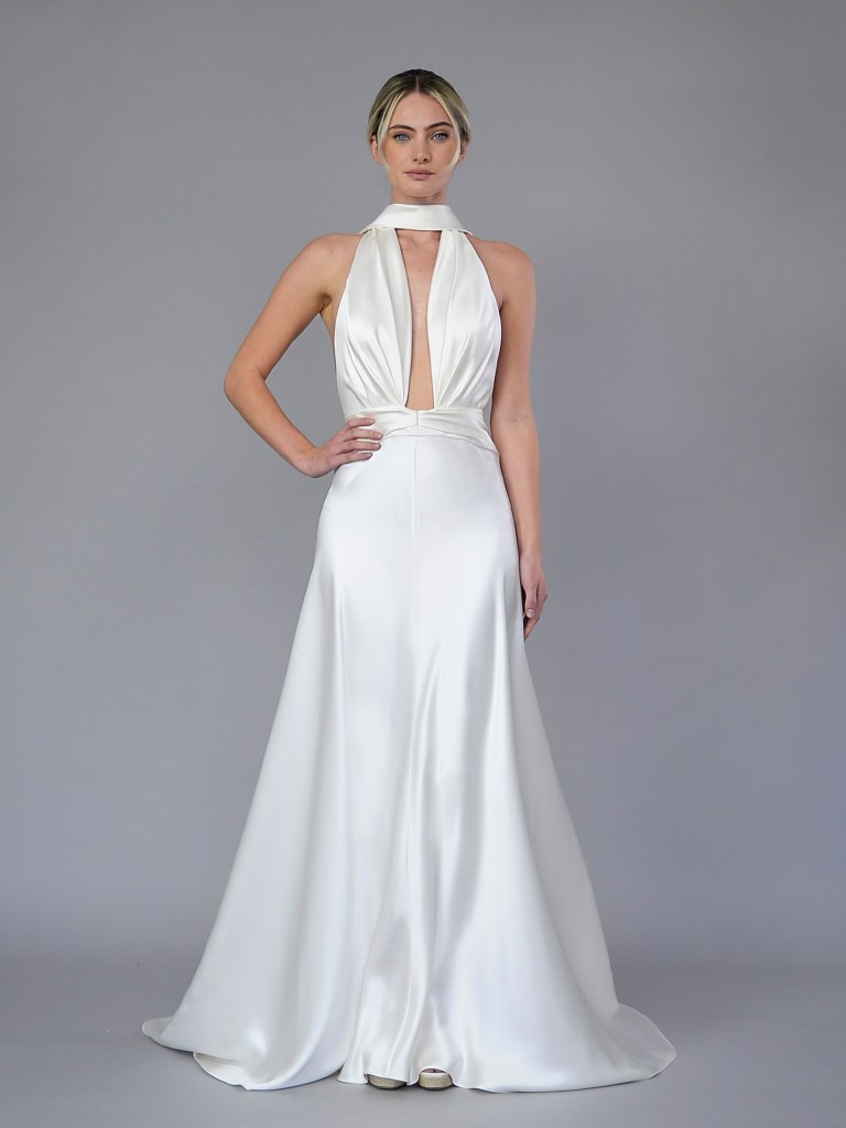 Halter neckline gown with side slit and pearl button closure in French double charmeuse. Lined with a silk charmeuse. Fabrics from France. A style from Carla & Kenneth collection. Made in USA.